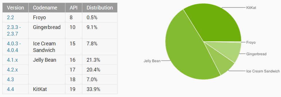 The rest of the numbers lay out as you’d expect them to. Alongside the aforementioned KitKat and Lollipop percentages, Jelly Bean combines for a whopping 48.7% of the share, Ice Cream Sandwich is still alive and well at 7.8%, and Gingerbread unfortunately still lingers around with a pretty good chunk at 9.1%.