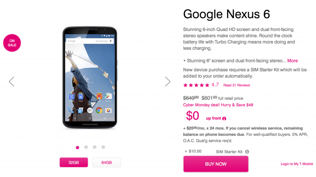 Those upset they missed out on the short lived return of the Nexus 6 to the Google Play Store earlier today might be lucky after all. As part of a Cyber Monday sale taking place online, T-Mobile is discounting Google’s latest handset a good $50. The deal is good for both 32GB and 64GB varieties, bringing the grand total to $600 and $650, respectively.