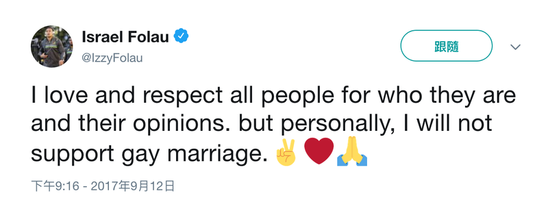 然而現代網路社會裡,凡走過必留下痕跡,Israel Folau 在 2017 年澳洲為了要不要通過婚姻平權鬧得沸沸揚揚之際時曾發表 twitter 表態不支持同性婚姻,諷刺的是,他與隊友 Adam Ashley-Cooper 在 2014 年於雪梨所舉辦的同志橄欖球賽事 Bingham Cup 曾以代言人的身份登上媒體,在該篇專訪中 Bingham Cup 的發言人表示 Israel Folau 有著強大的決心要終止於運動中任何形式的歧視。