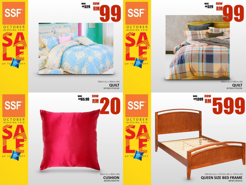 每天工作辛劳回到家,第一件事就想躺床!寝室是家中最让人放松的场所,所以寝室的布置非常重要!一张舒适的床褥、大气的床架、实用的梳妆台等,打造简单又不失温馨感的睡房!SSF将会在整个10月份进行「寝室产品促销」,特选的产品将有折扣高达70%!迎合个人独特需求选购产品,以超抵价格将睡房打造成自己觉得最舒适的状态~