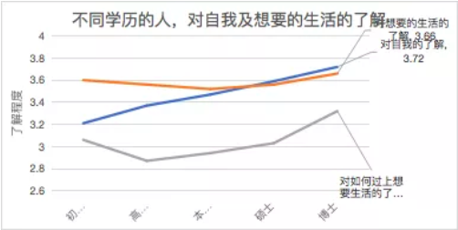 學歷對於人們對「自我的了解」以及「如何過上想要的生活」的影響較為明顯—— 學歷更高的人,自認為對自我的了解程度更高;學歷更高的人,也顯著地更知道如何過上自己想要的生活。