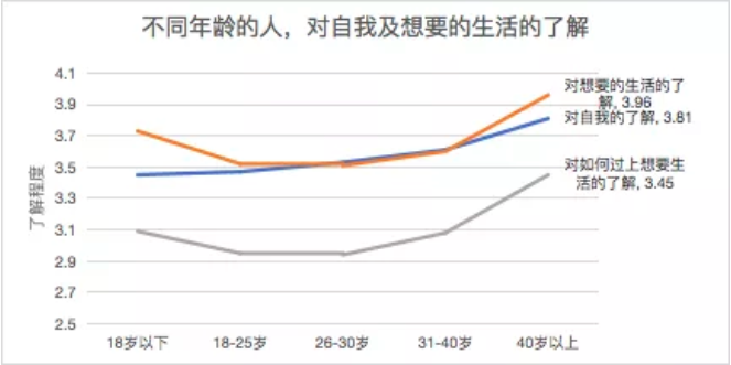 從年齡的角度看,我們得到一個有趣的結論。18 歲以下的人,認為自己對於想要生活的了解程度,比 18-25,26-30 甚至是 31-40 歲的人還高。這有可能是因為年輕時,我們對於現實的了解有限、過於簡化現實,而隨著認知更多考慮也會更複雜起來。這樣來看也許人越活越迷茫,是一種常態。