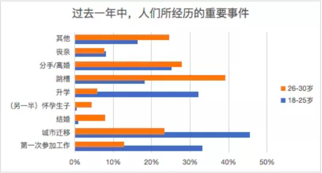 我們首先統計了一下,18-25 歲,以及 26-30 歲的人,他們的生活中正在經歷什麼。我們可以看到,分手、升學、第一次參加工作,是 18-25 歲人群中頻繁出現的重大轉折性事件,在 26-30 歲的人群中,則還會頻繁看到跳槽和城市遷移。