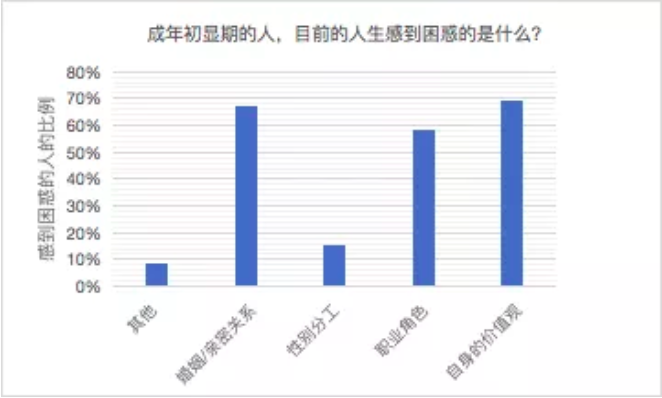 成年初顯期的人,感到最為困惑的兩件事是:自身的價值觀,以及婚姻/親密關係(兩項都有接近 70% 的成年初顯期用戶選擇)。如果你身處這個年齡段,而覺得自己已經對上述某項有了較為清晰的認知,恭喜你,你已經是人群中領先的 30%。