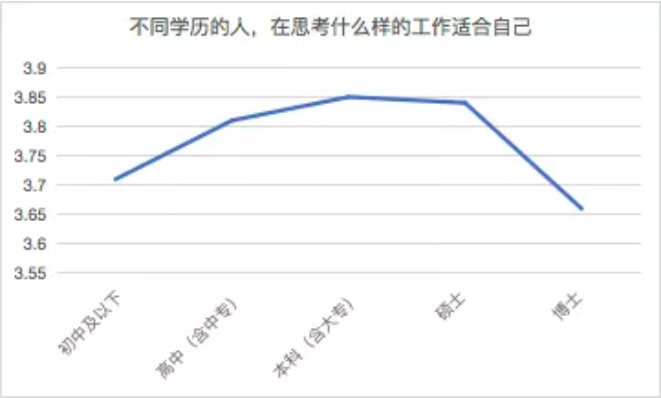 同處在「成年初顯期」,但不同學歷的人,在和職業相關的題目中展現出了非常有趣的兩條相互呼應的折線。本科生思考自己職業方向的程度最高,碩士次之,高中生的思考也不少,到了博士學歷則職業思考的程度顯著下降。