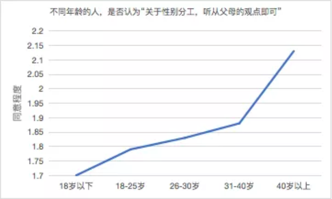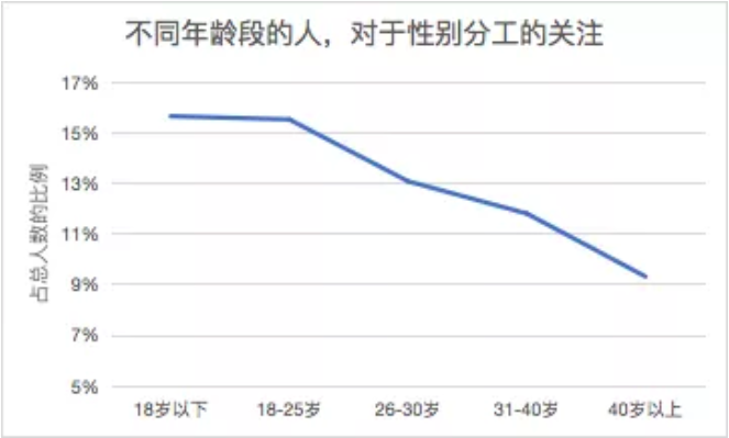 新一代人對於性別分工更具反思性,大多數人認為應該自己思考性別分工問題。我們看到,越年輕的人,越表示自己關注性別分工問題,越不認同僅僅是接納上一代人的觀點。年齡越大的人,越覺得沒必要思考性別問題。