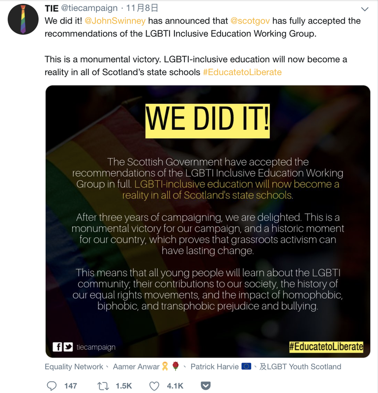 11 月 8 號,為促進 LGBTQ+ 教育權益奔走的蘇格蘭全納教育來臨組織(Time for Inclusive Education,TIE),在 Twitter 上如此寫著,為減少霸凌、歧視,蘇格蘭政府將採納他們的建議,全面將 LGBTQ+ 議題納入學校教育,而蘇格蘭也成為全世界第一個支持將 LGBTQ+ 納入教育的國家。