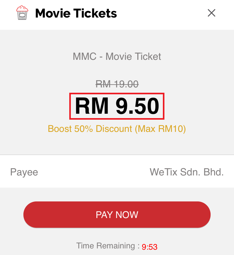 50%折扣优惠后,2张MBO戏票只需RM9.50,一张戏票只需RM 4.75!但必须注意的是各个地区电影院的价格可能会有所不同。