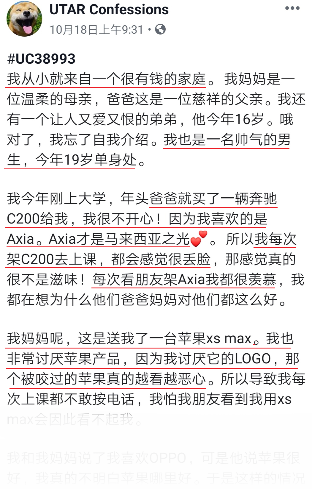 不过,一名网友在面子书上po文写道「我来自一个很有钱的家庭。我上大学时,爸爸买了一辆奔驰C200及妈妈送一台苹果xs max给我」!但获得这些“礼物”的帖主使他感到不开心,甚至是讨厌!