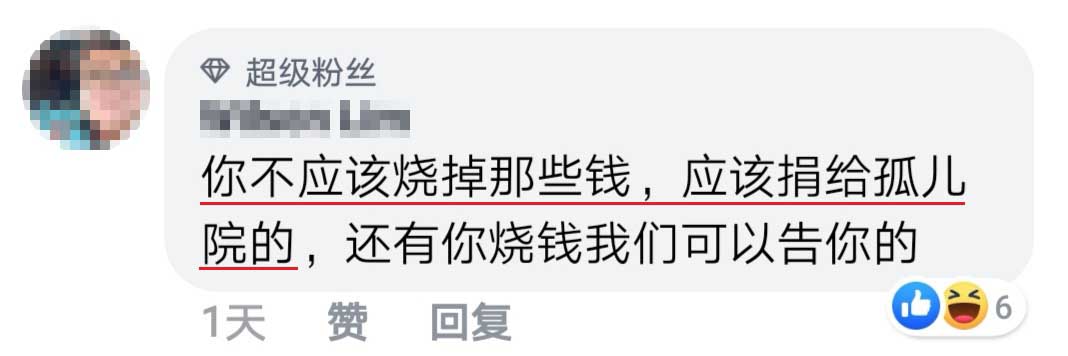 ▼ 网友吐槽不应该把钱拿去烧掉!而是把钱捐给孤儿院或者是把钱寄给网友们!