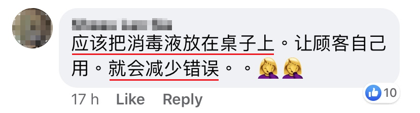 ▼ 下一刻就大事不妙了!该顾客看到店员拿起洗手液时,她就下意识地伸出左手,准备给店员喷洗手液!怎知该店员并没有在她手上喷洗手液,反而是往她的眼部喷!