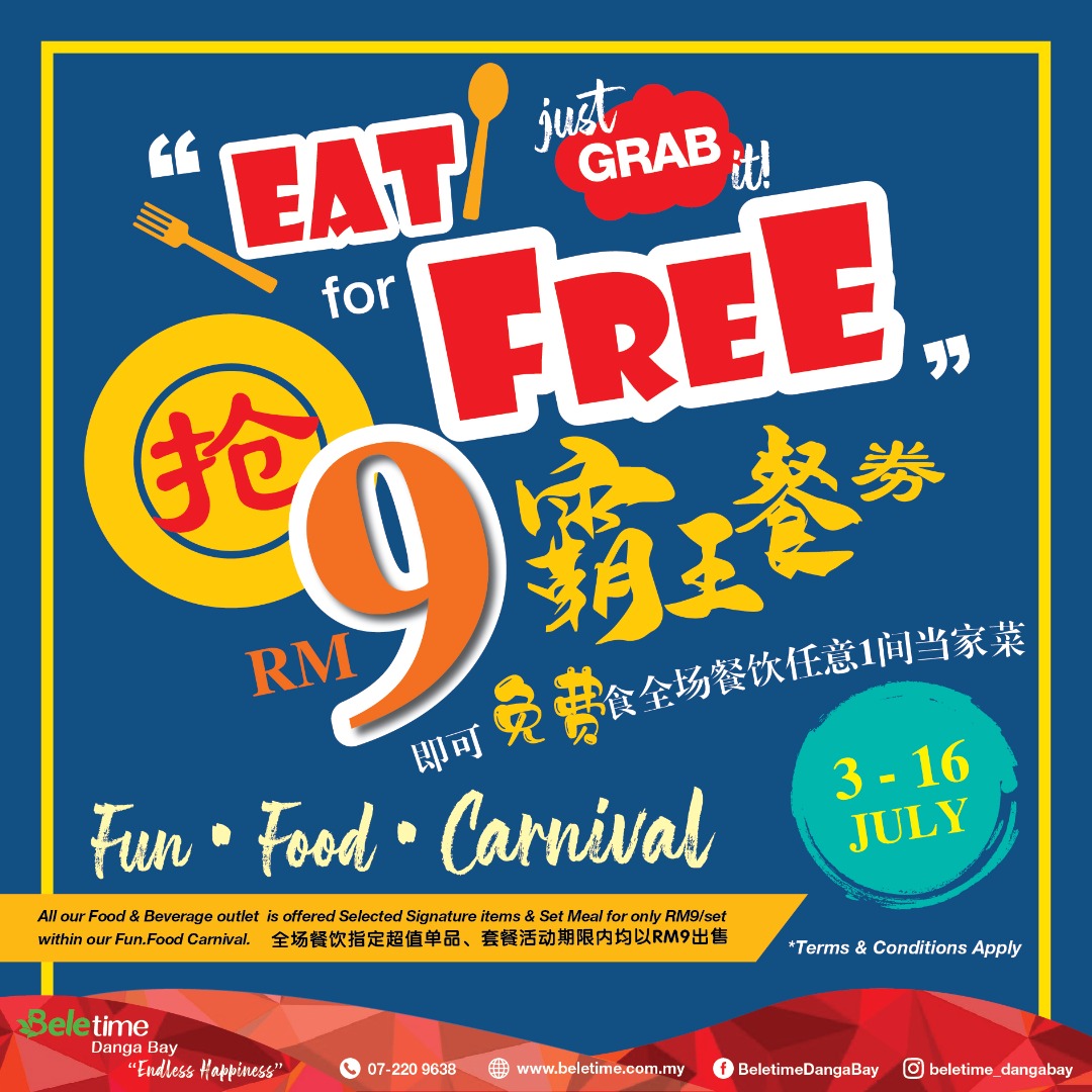 从未吃过“霸王餐”?想免费享美味?找不到便宜好料?姐妹们,尖叫时刻来袭!碧乐时光·金海湾购物中心将在来临的7月3日至7月16日举办一场「抢RM9霸王餐券,任食全场」免费福利活动!还等什么,准备‘抢’一波啦!