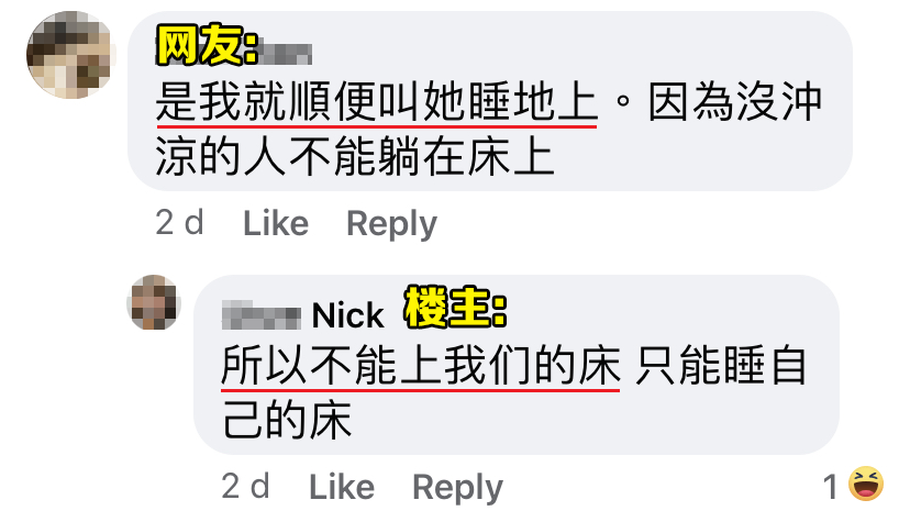 ▼ 由于女儿三天不洗澡,所以原PO表示也不让她和爸爸妈妈一起睡觉哦!