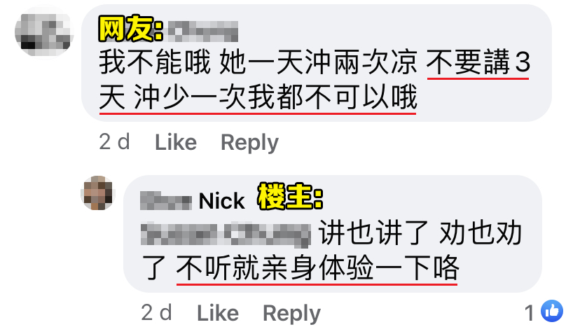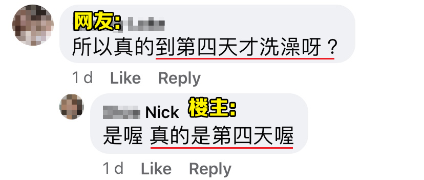 我爸妈如果知道我三天不给孩子冲凉,一定会说我疯了,一定要碎碎念我,说什么不冲凉很肮脏啦、对身体不好啦一大堆,我知道啊!重点是孩子她不懂啊,我讲她不听啊!现在好了,她体验了一轮有多脏、多不舒服,道理自己明白了,以后就会乖乖冲凉。