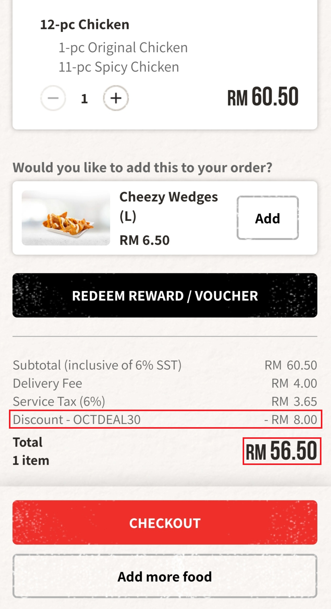 此外,若你想订购炸鸡Bucket 套餐也行哦!可使用这优惠码来Order 12块炸鸡Bucket!