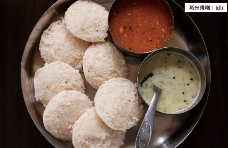 南印度的Idli,由磨成漿的米蒸熟而成,並附上沾醬和蔬菜咖哩湯 /英語島編輯室