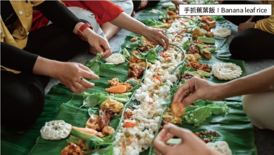 傳統的印尼蕉葉飯,將蕉葉做為容器鋪在地面,並放上食物 /英語島編輯室