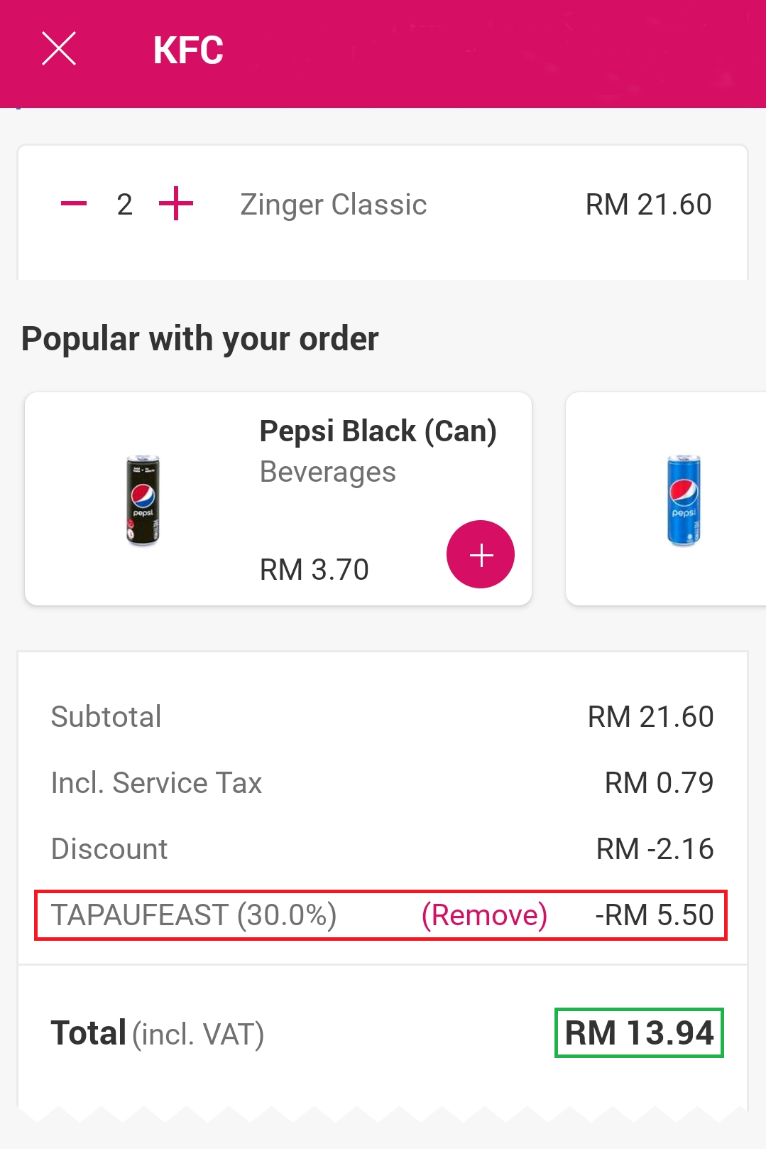 ▼ 2粒Zinger Burger 原价RM21.60,折扣10%Pick-up+30%【TAPAUFEAST】后只需RM13.94!平均一粒汉堡只需RM6.97!