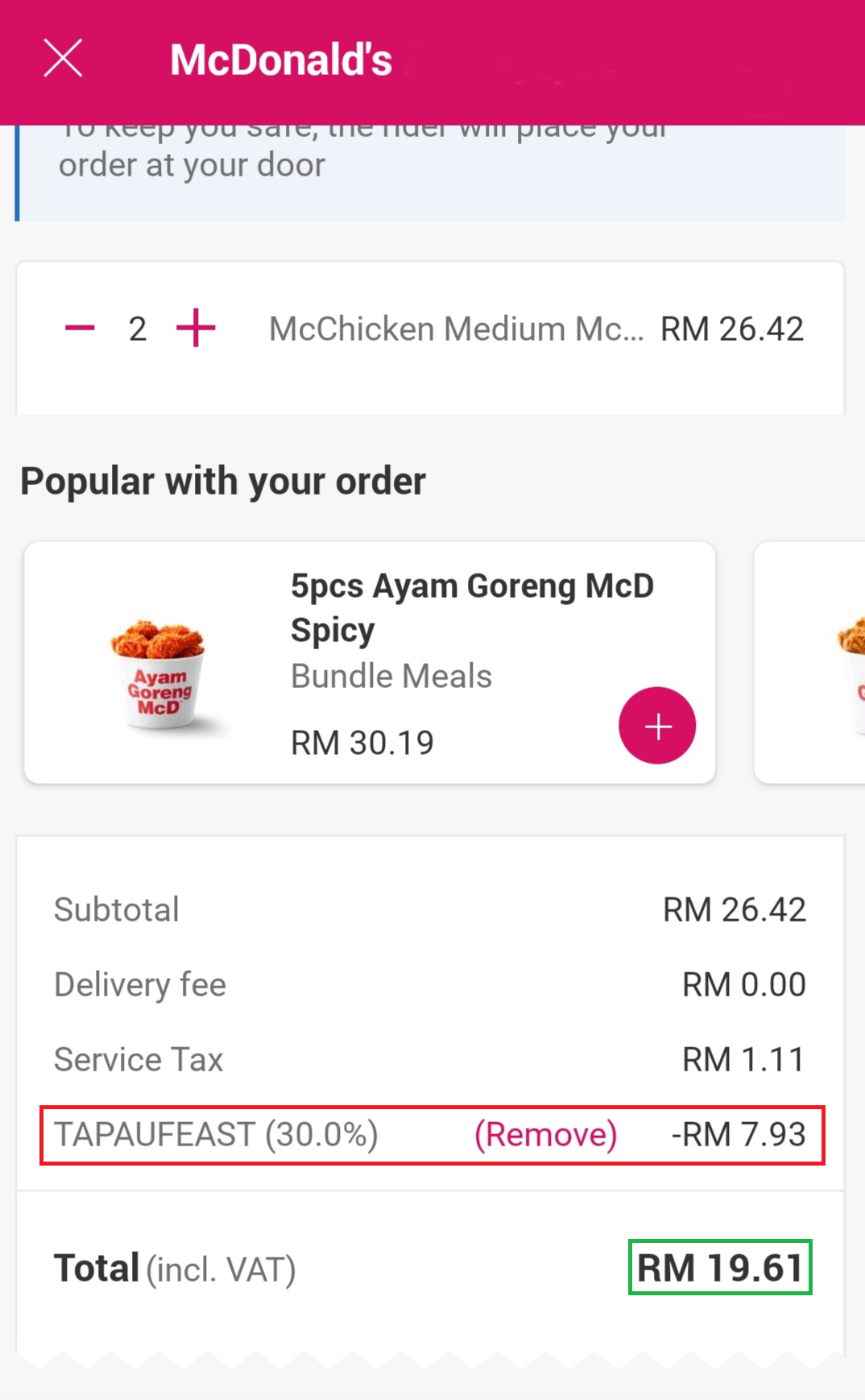 ▼ 2粒McChicken Burger 原价RM16.98,折扣30%【TAPAUFEAST】后只需RM12.60!平均一粒汉堡只需RM6.30!