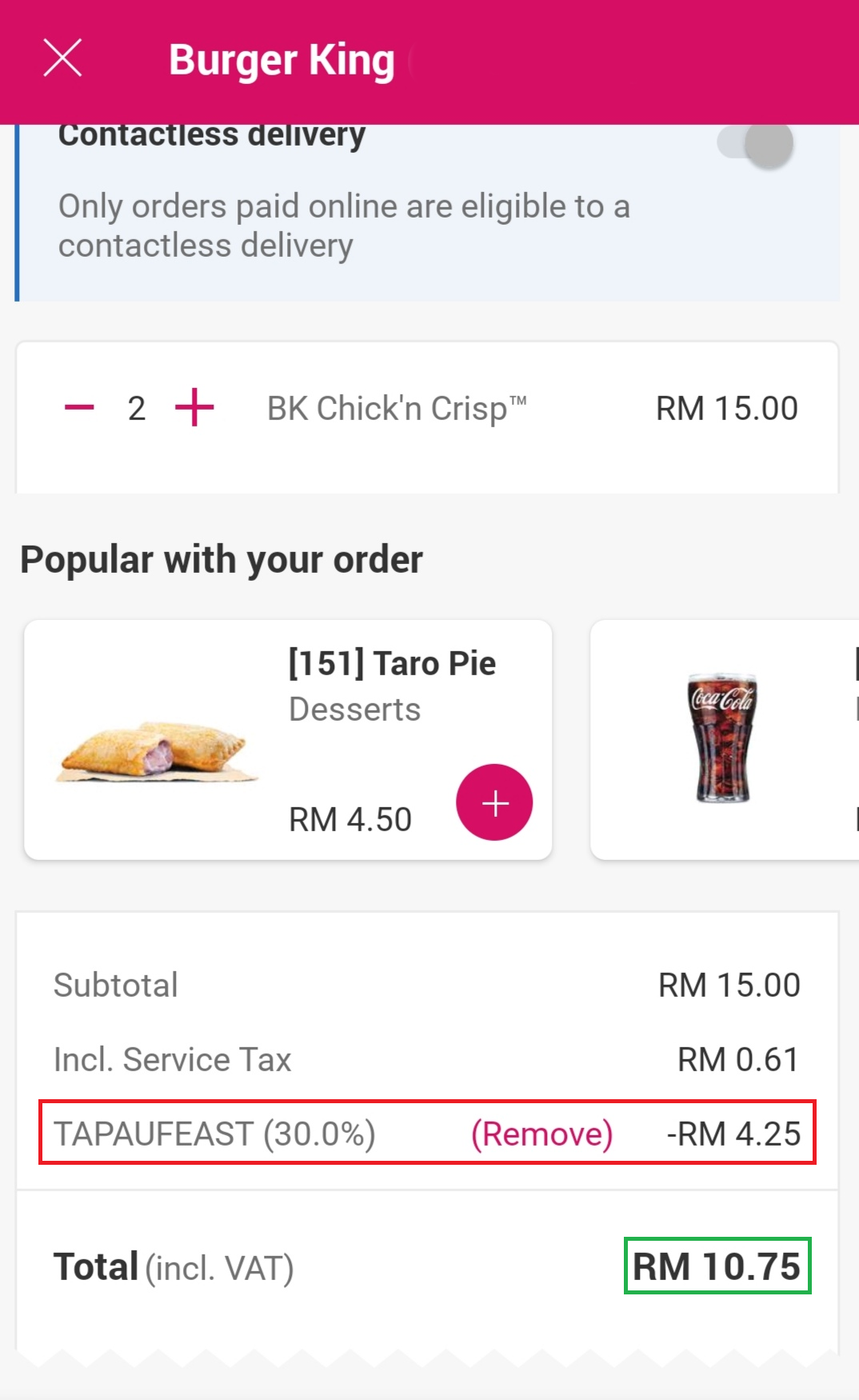 ▼ 2粒BK Chick’n Crisp 汉堡原价RM15,折扣30%【TAPAUFEAST】后只需RM10.75!平均一份汉堡只需RM5.38!